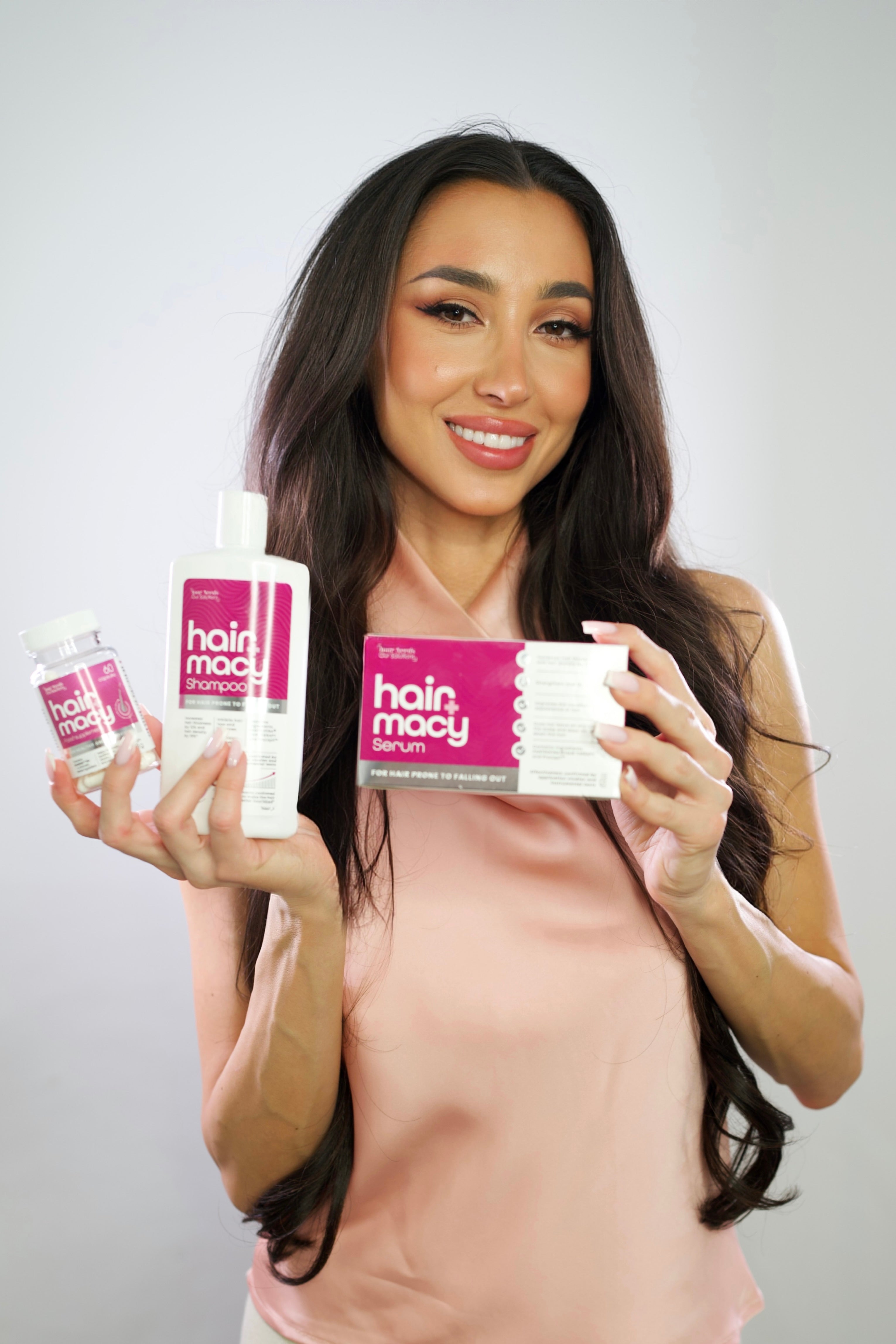 Das Hairmacy Set kombiniert Shampoo, Serum und Supplement zu einer ganzheitlichen Kur, die von außen und innen wirkt.